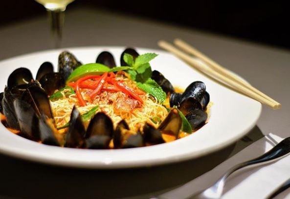 Spicy Ipoh Laksa broth with mussels from the British coast. Mussels are cooked in the broth to infuse it with seafood flavour. Accompanied by vermicelli noodles to soak up the broth.