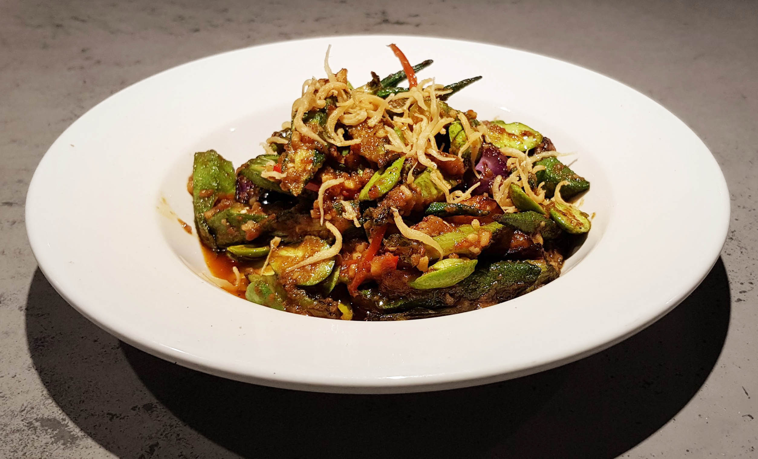 Stir fried okra with sambal (prawn paste), and red chilli.