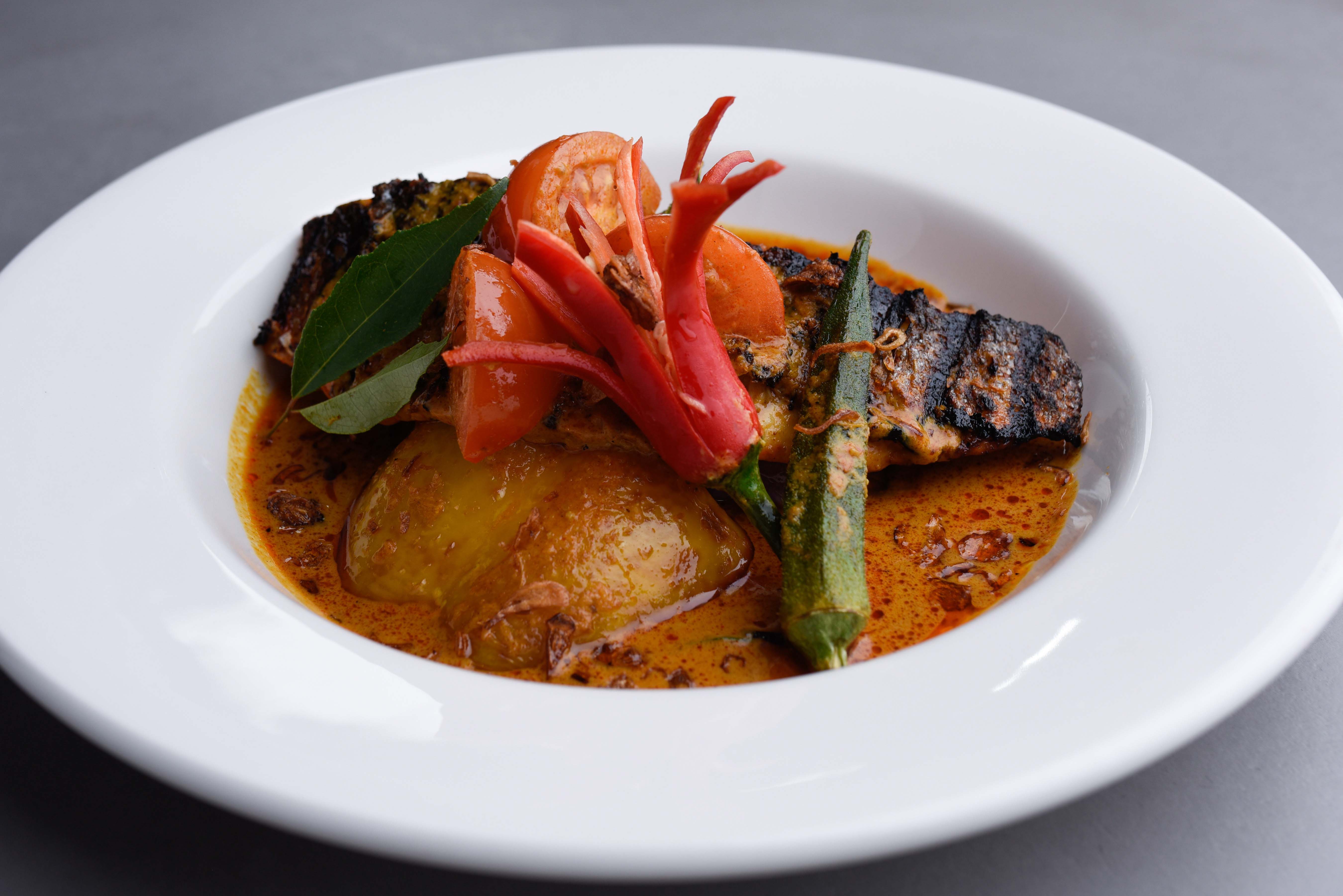 Grilled sea bass fillet with hot and sour curry sauce, aubergine, tomato, okra and grilled bell pepper.
