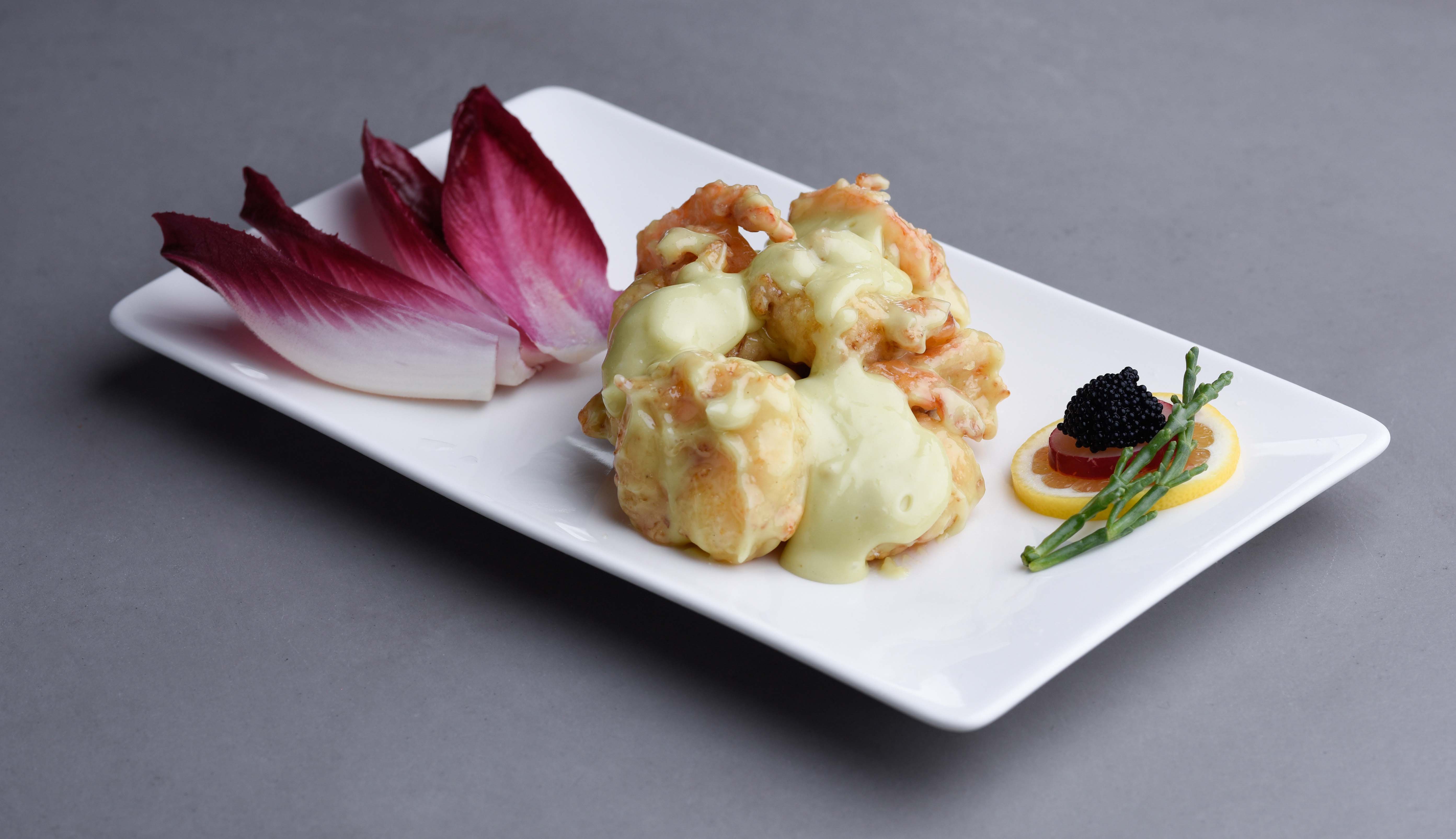 Deep fried king prawns with fish roe & wasabi mayo.