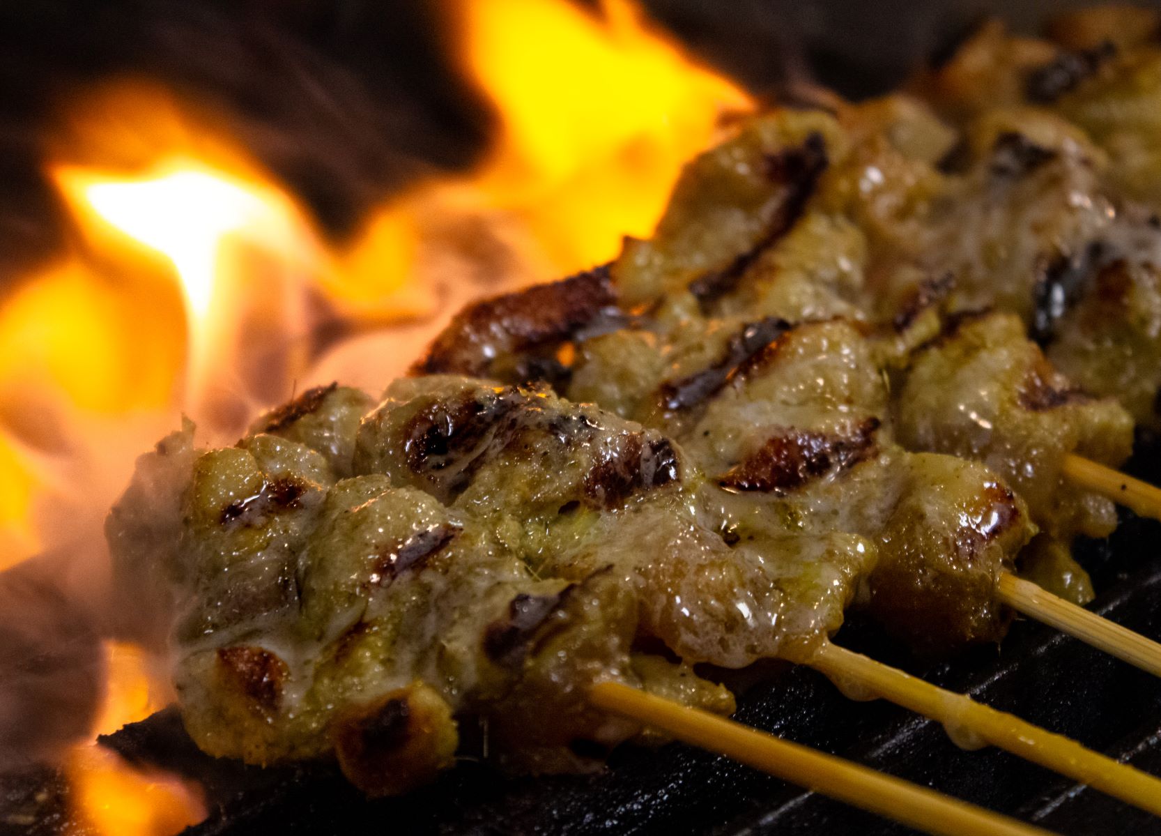 Four skewers of satay chicken served with spicy peanut sauce.